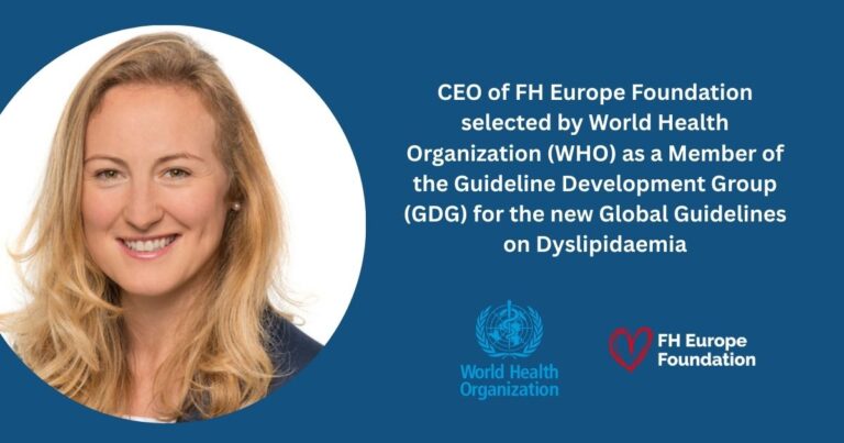 Magdalena Daccord, CEO of the FH Europe Foundation, has been selected by the World Health Organisation (WHO) as an expert member of the Guideline Development Group (GDG) on dyslipidaemia. She will contribute strictly in her individual and independent capacity, in full accordance with WHO rules, and not on behalf of any organisation. The WHO, the … Continue reading FH Europe CEO Joins WHO Expert Group on Dyslipidaemia